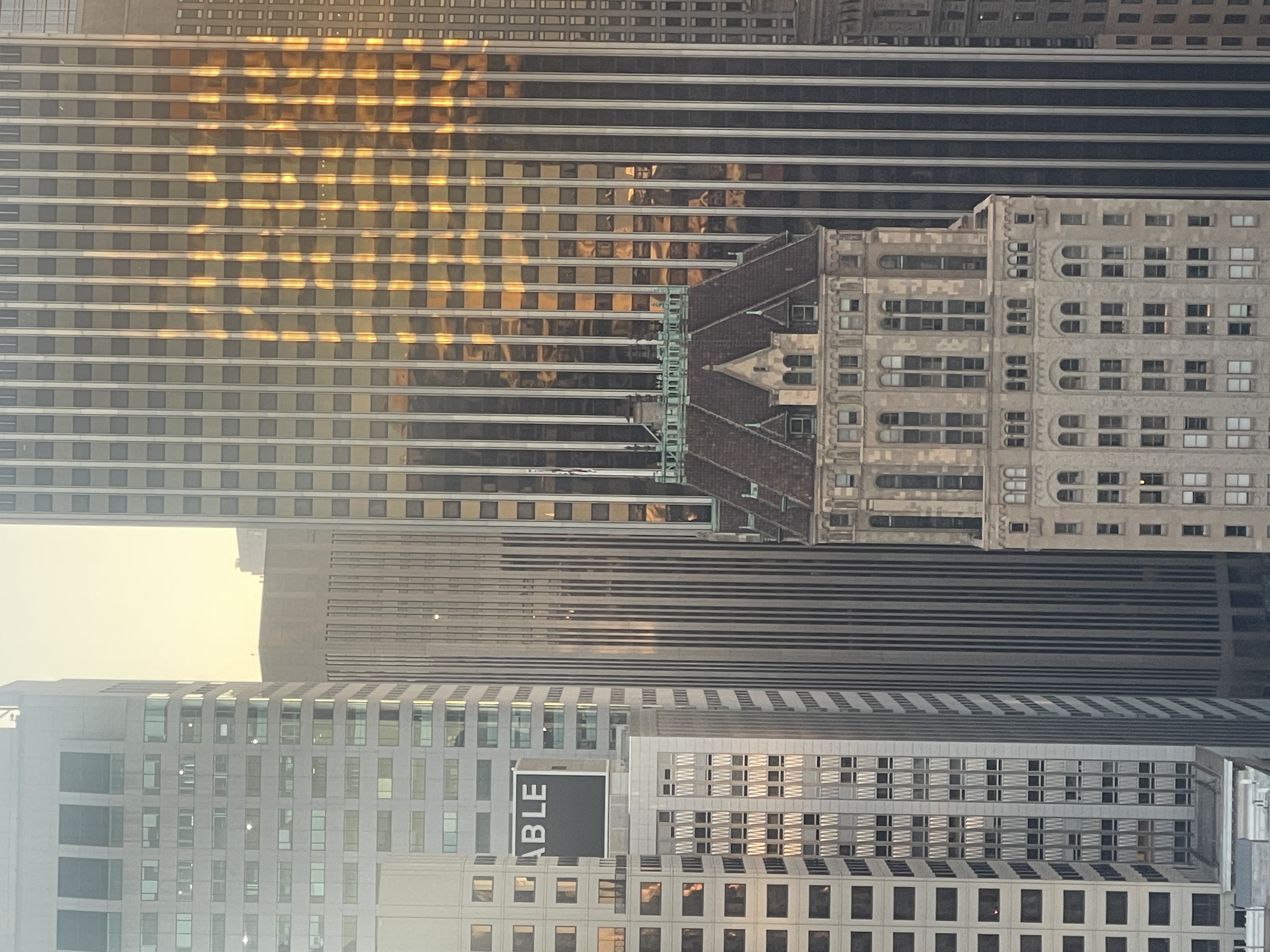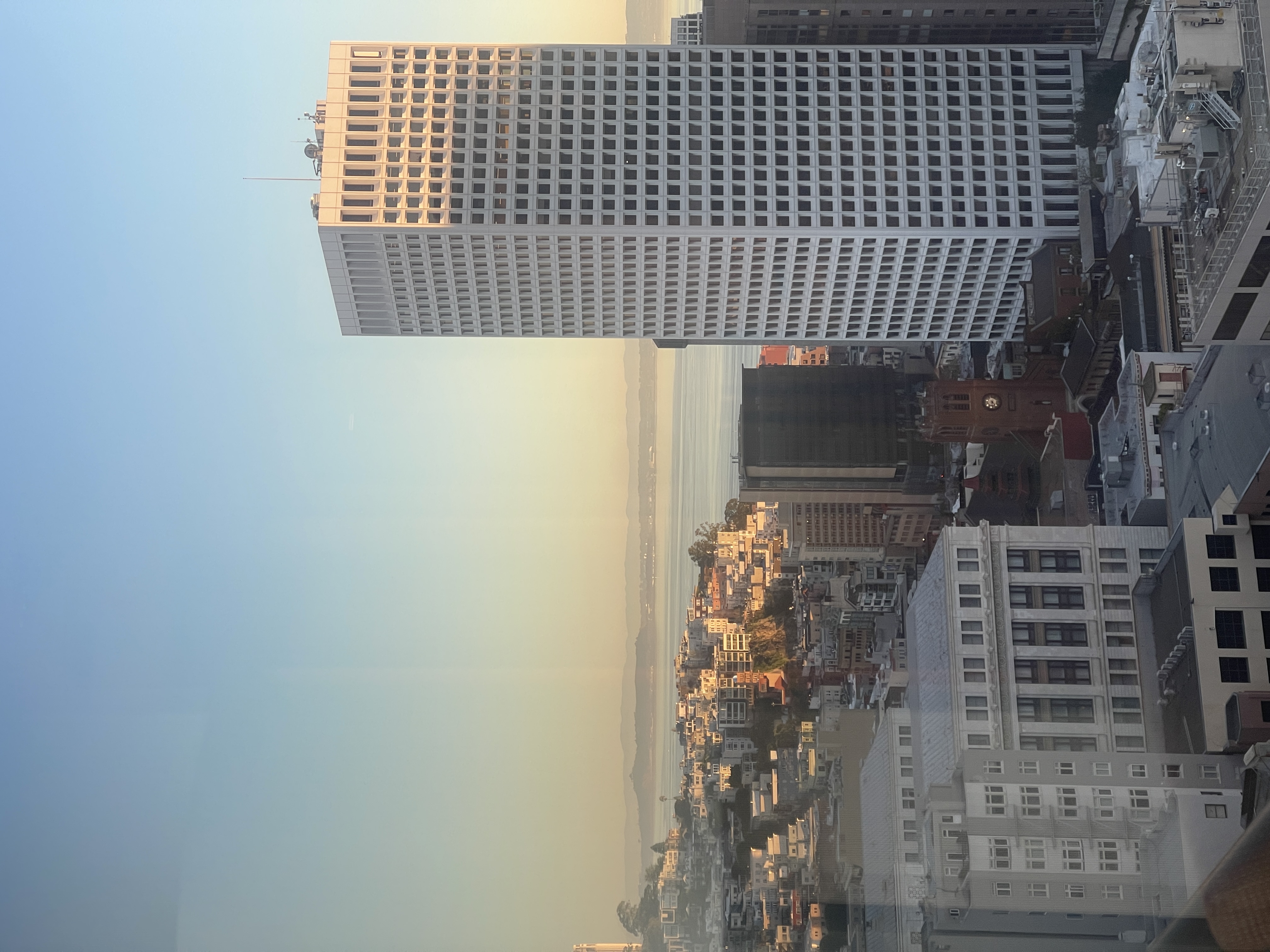 Sunday morning I had my last coffee at the window, describing the view out loud to myself the way you do when you’re trying to memorize something before you have to give it back. The Transamerica Pyramid. The bay appearing in the gaps between towers. The Salesforce Tower catching the early light. An ornate old building below, all stone and copper trim, holding its ground between the glass. Ships in the distance waiting for their next cargo load. And then, on a rooftop just visible between two skyscrapers: a single word on a building.