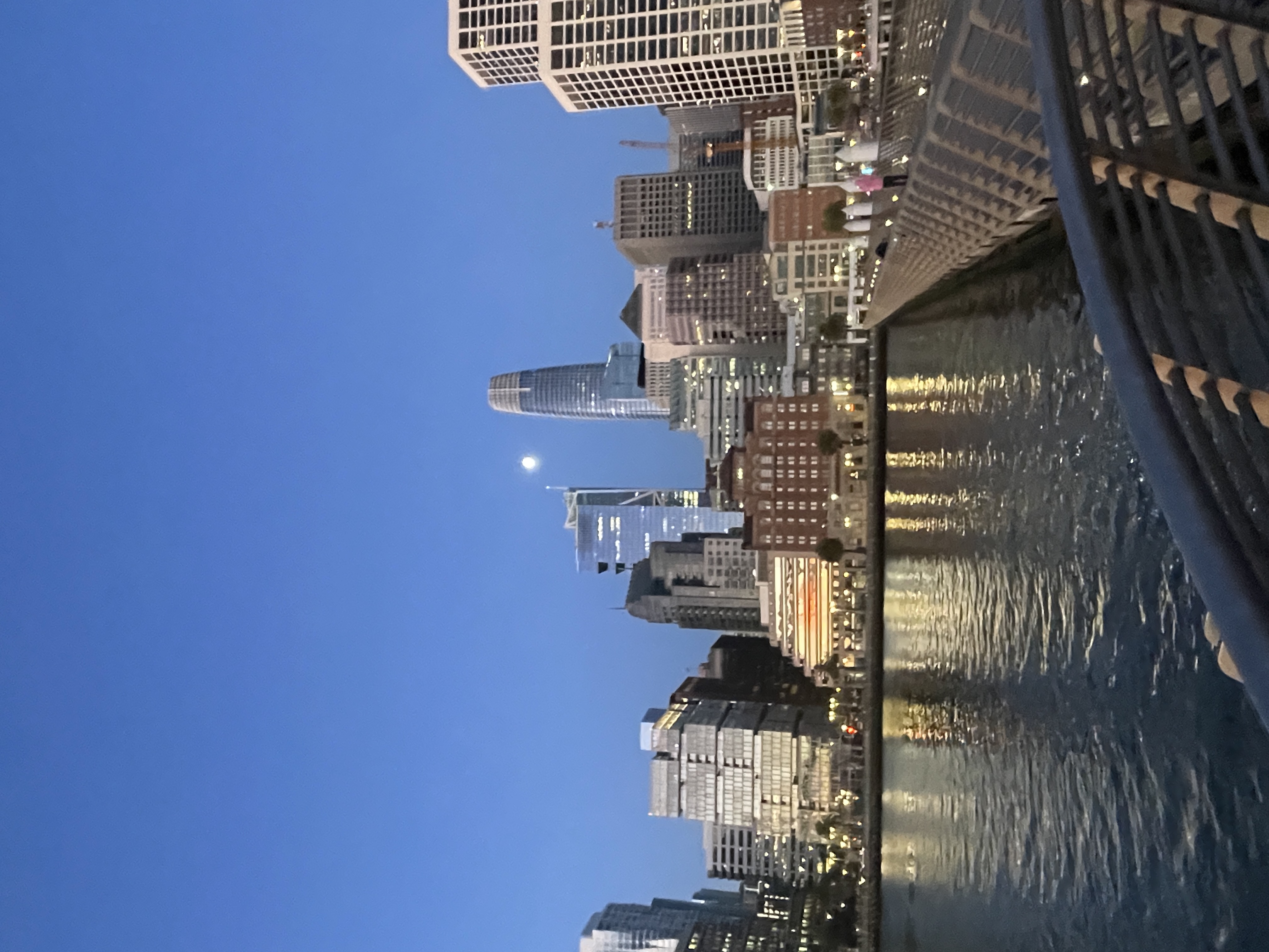 I got there before the light. The Ferry Building clock tower slowly going golden. The Bay Bridge still holding the last of the night sky. The moon sitting just beside the Salesforce Tower — the one that had welcomed me the night before — and the whole city reflected in the water below.