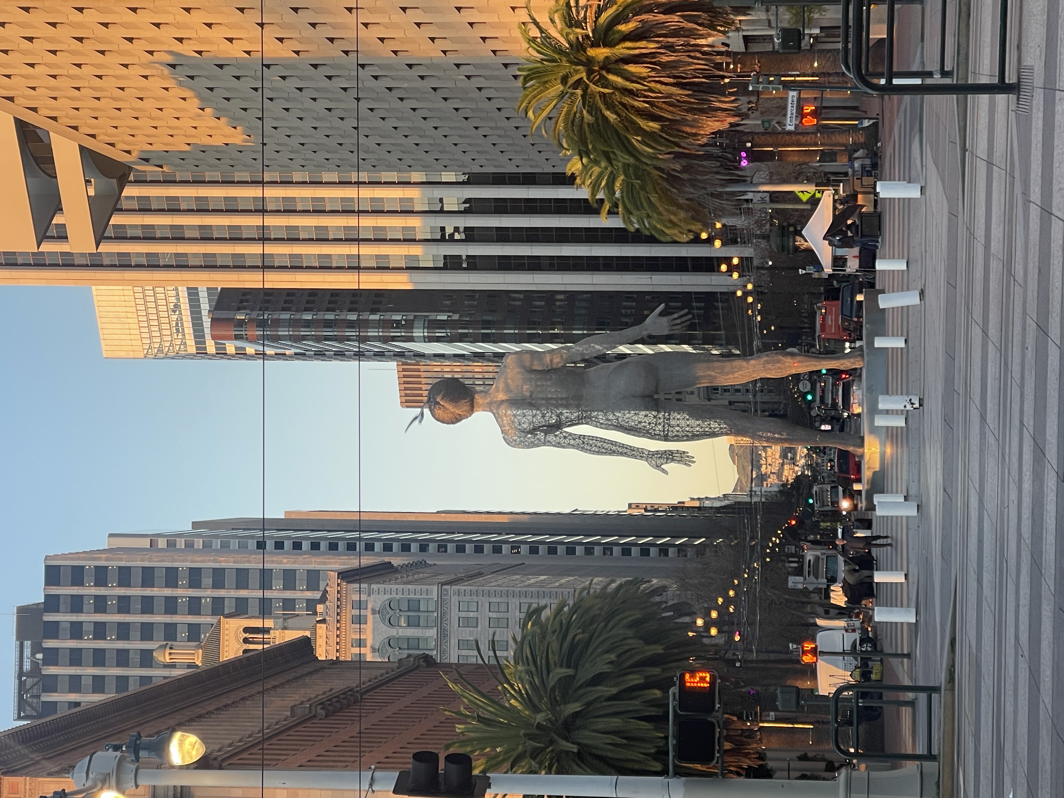Bliss Dance. A 40-foot steel woman by Marco Cochrane, made entirely of open lattice so the light passes through her. Arms open. Facing Market Street. Standing there at 6:40 in the morning like she’d been waiting for the parade, like she’d been waiting for all of it. I couldn’t have planned her.
